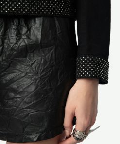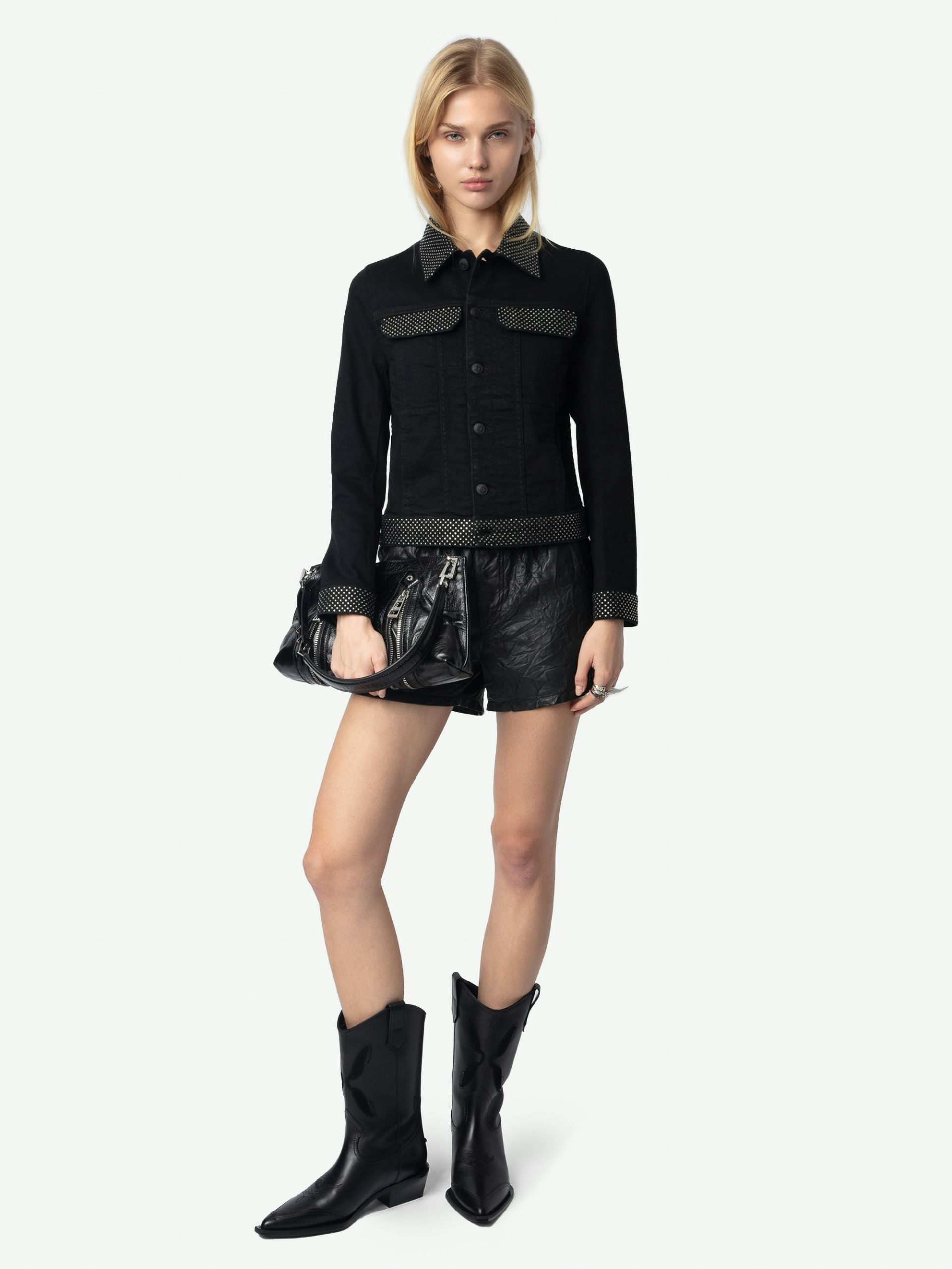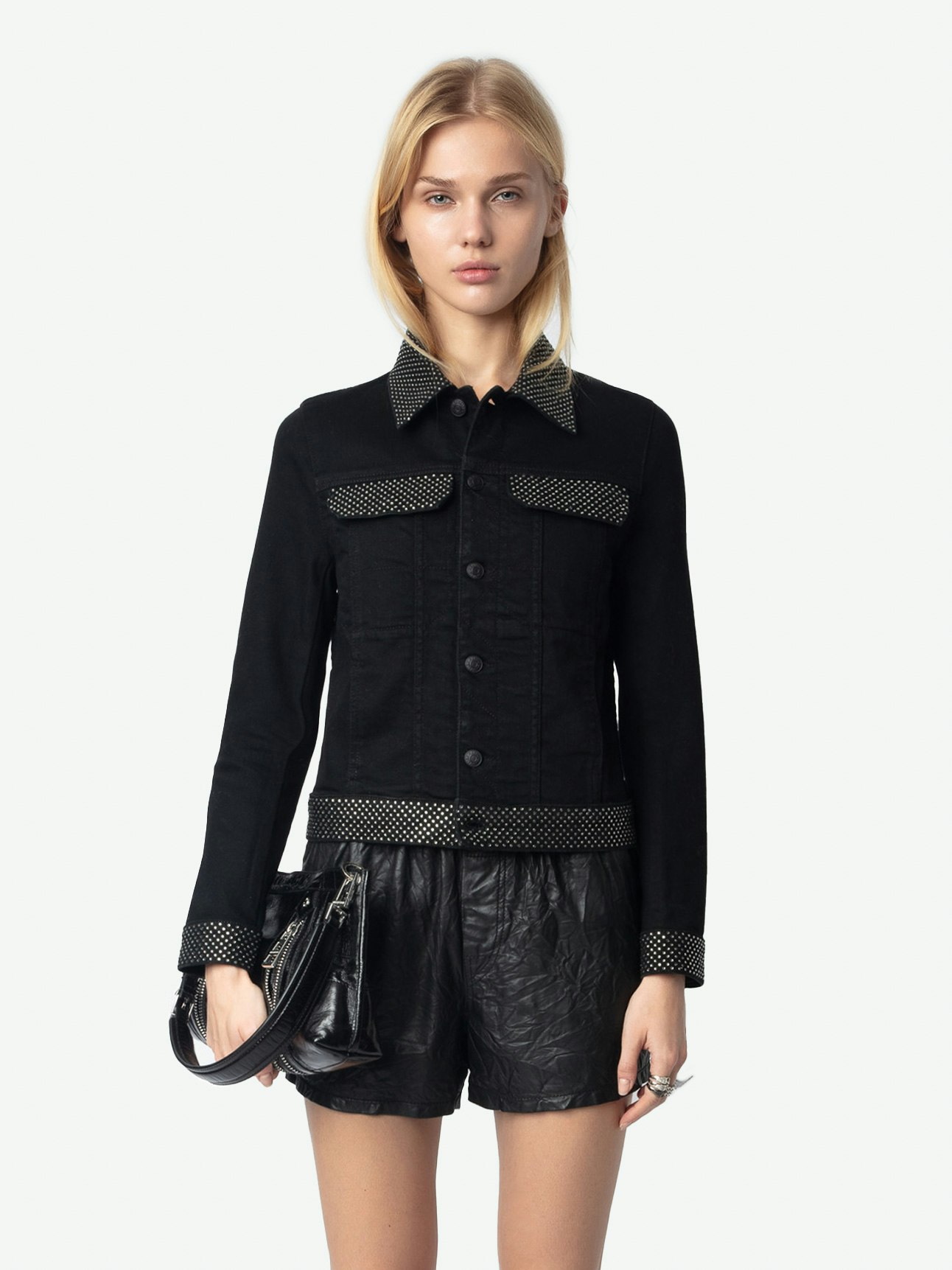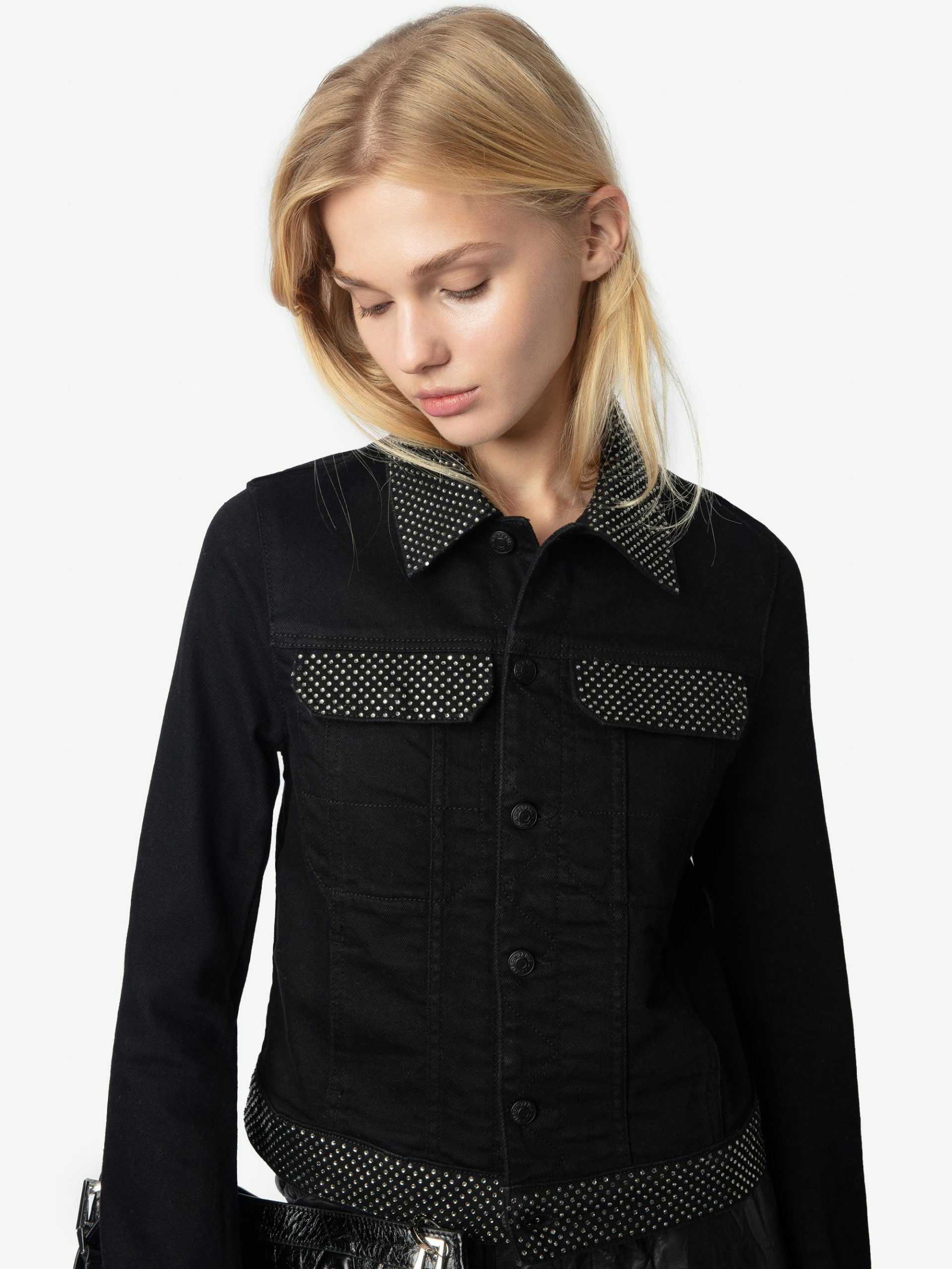 – Cuello, bolsillos y bordes adornados con strass